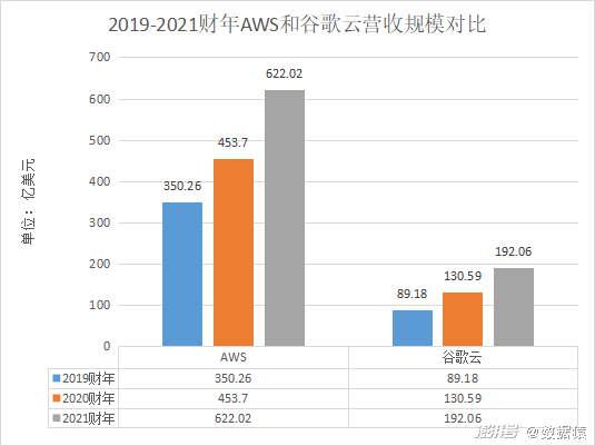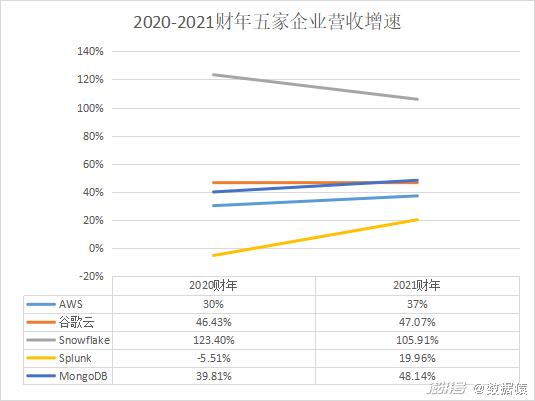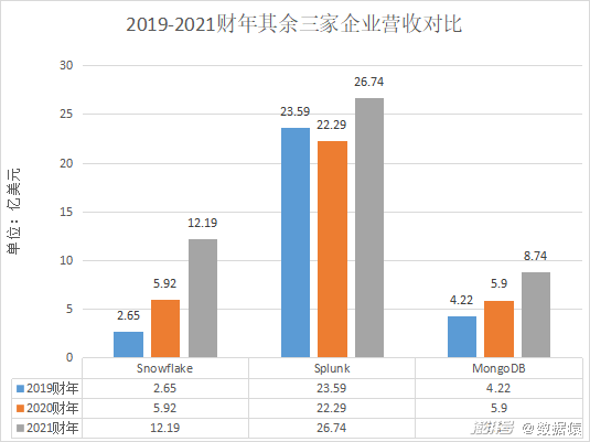 为了使对比数据统一,接下来将以各企业2019-2021财年大数据领域相关业务财务数据进行对比参考。(注:由于公开披露数据存在局限性,各企业更细分业务数据暂时无法获取,接下来将尽量选择各企业大数据领域相关业务数据。亚马逊选取AWS业绩数据,谷歌选取谷歌云业绩数据,Snowflake、MongoDB、Splunk选取公司整体业绩。)