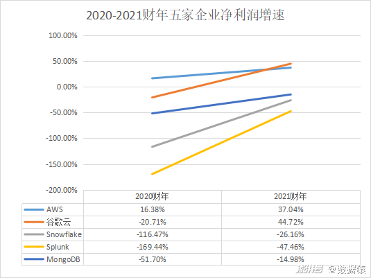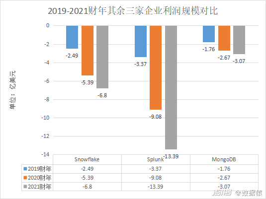 统计以上数据发现,上述五家企业或企业部分业务业绩在营收上都是呈现逐年增长的态势,并且增长幅度较大,不过,在盈利规模上,除亚马逊的AWS实现了盈利之外,其余四家企业或企业部分业务还处于常年亏损之中。除了谷歌云的亏损程度有所收窄之外,Snowflake、Splunk、MongoDB这三家处于成长期的大数据企业的亏损程度还在增大。