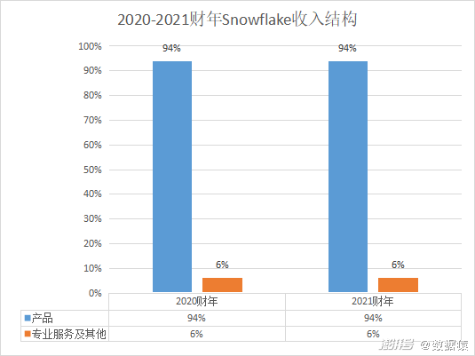 Snowflake的业务主要包括数据仓库、数据湖、数据工程、数据科学、数据应用程序开发和数据共享,Snowflake提供的是一个基于云的数据平台,使客户能够整合数据,以构建数据驱动的应用程序,并共享数据。Snowflake另一重点业务是为垂直行业定制解决方案,推出了金融服务数据云、媒体数据云、医疗保健和生命科学数据云以及零售数据云。不过在收入结构上,Snowflake仅分为了产品收入和服务收入两大类别,2020-2021财年,Snoeflake产品收入占比均为94%,专业服务及其他收入占比均为6%。