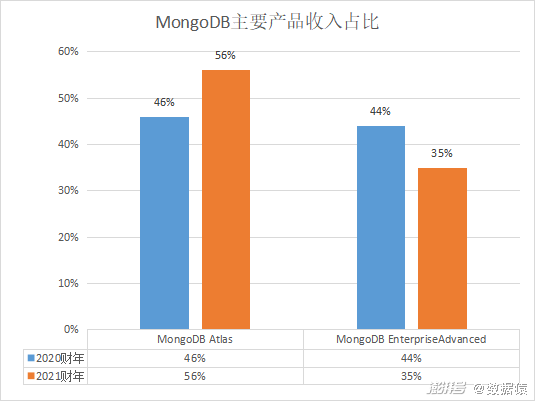 数据显示,MongoDB的收入95%以上都来源于产品的订阅销售。分开来看,主要产品包括MongoDB Atlas、MongoDB EnterpriseAdvanced,2020-2021财年MongoDB Atlas收入占总收入的46%、56%,MongoDB EnterpriseAdvanced收入占总收入的44%、35%,可以看出,MongoDB Atlas收入占比逐年上涨,MongoDB EnterpriseAdvanced收入占比则是有所下降。