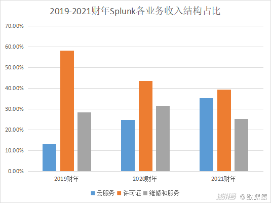 从收入结构来看,Splunk收入分为云服务收入、许可证收入以及维修和服务收入。Splunk的收入组合已经从许可证销售转向云服务交付,预计它未来还将继续向云服务倾斜。财报披露数据显示,2019-2021财年云服务收入占比分别为13.2%、24.9%、35.3%;许可证收入分别为58.2%、43.6%、39.5%,逐年下滑;维修和服务收入分别为28.5%、31.6%、25.2%。