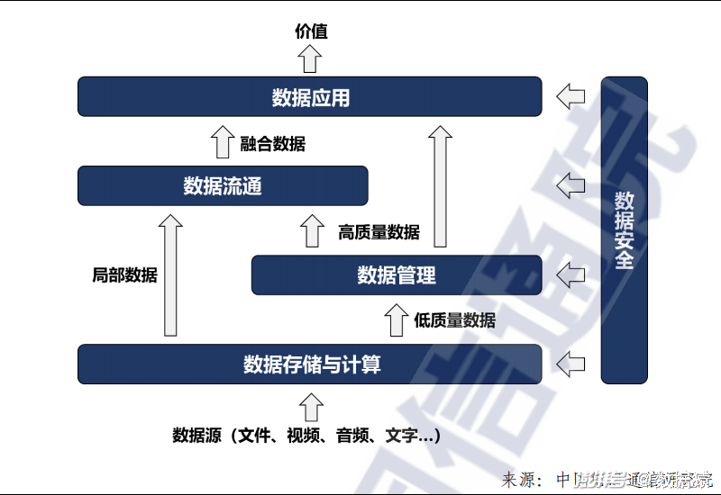 此外,从技术发展角度来看,数据存储与计算、数据管理、数据流通、数据应用、数据安全是大数据产业重点发展的五大核心领域。从流程上看,数据源通过数据存储与计算实现压缩和初步加工,通过数据管理提升质量,通过数据流通配置给其他相关主体,通过数据应用直接释放价值,并由数据安全技术进行全过程的安全保障。